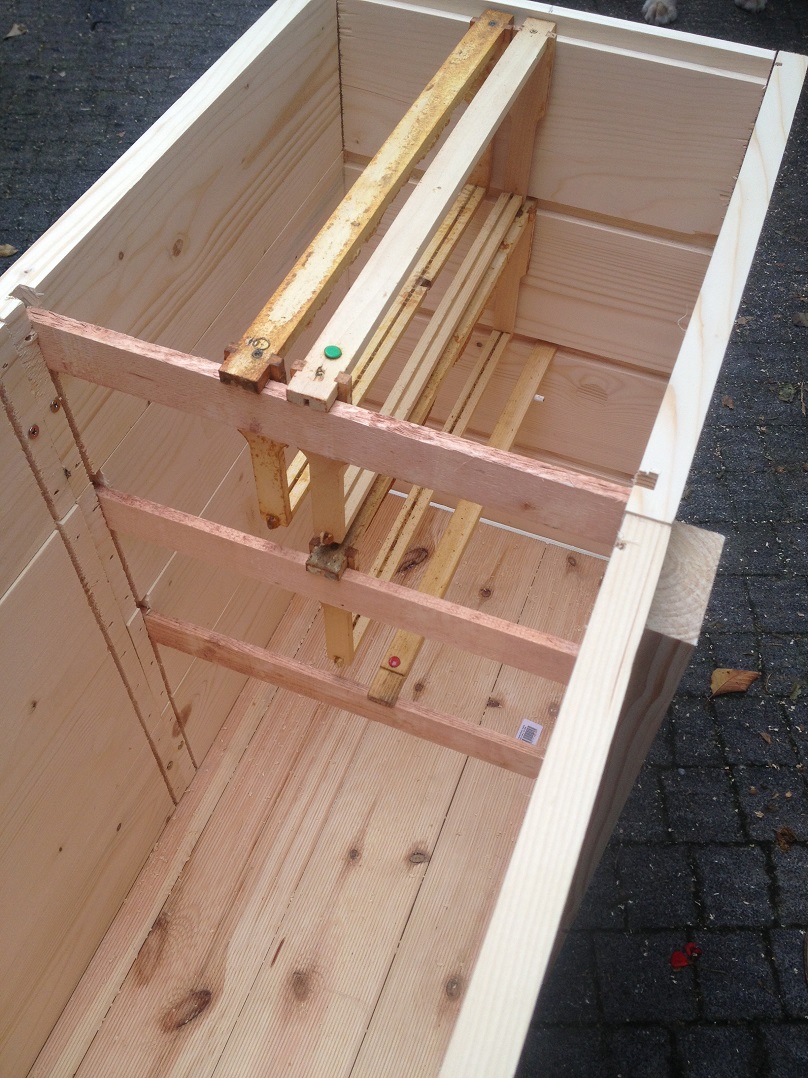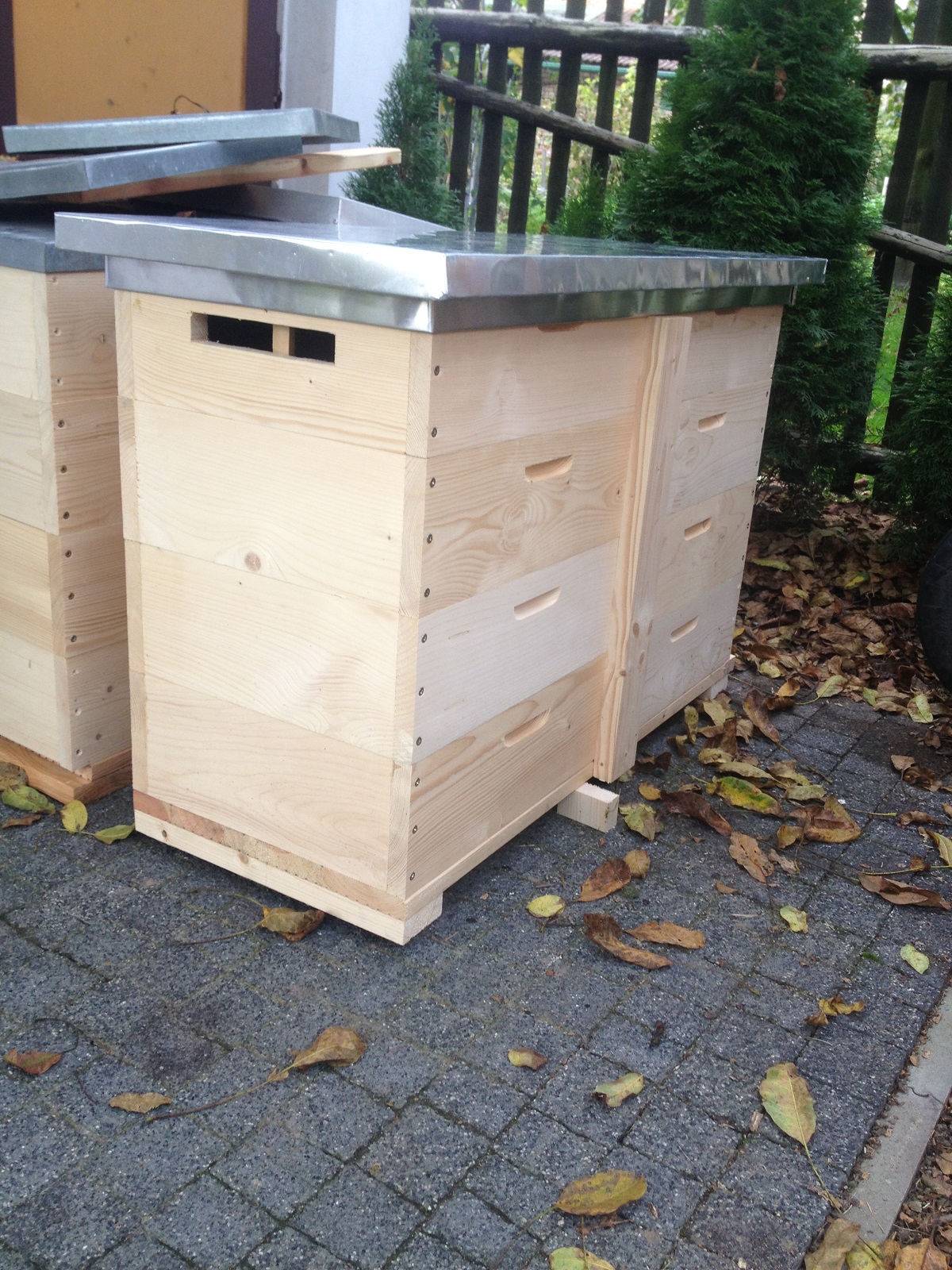 To co leží vedle jsou medníky pro případ velké snůšky, dva za sebou 43x17, ale říkal p. Nymsa, že pro jeho snůšku je to skoro zbytečný. Na bocích má asi 0,5 cm polystyren zčásti jako zateplení, ale hlavně na zakrytí škvír po seschnutí dřeva.