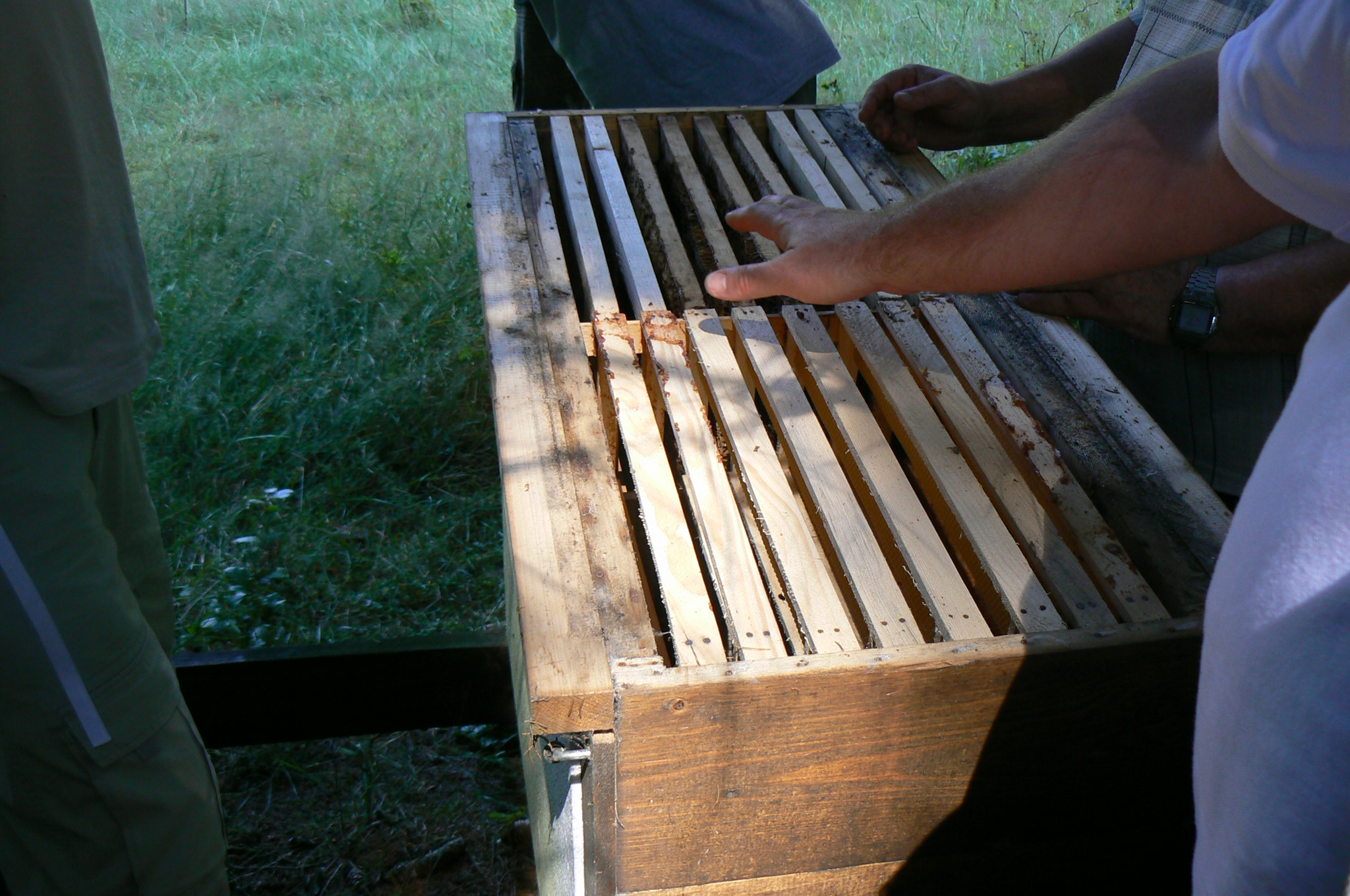 tady mám pár snímků vnitřního prostoru , v zásadě je v přední části úlu plodiště na "rámcích" kde mi horní loučka vychází na 52 cm , to uprostřed je jen 10mm vzpěra, kterou dokáží zastavět dílem. Dole rámek není ukončen, včely mají přirozeně zakončené dílo. Celé to staví bez mezistěn, přírozená stavba . Budu dávat buď standardních 10 nebo 9 to ještě rozhodnu