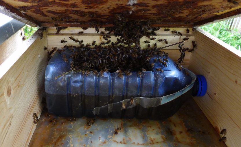 Pětilitrovka od vody z Lidlu za 11-12 českých. V ní je kus něčeho co roste kolem (pelyněk), stačí jedna větvička. Netopí se v tom. V prázdném nástavku, přiklopeno mezidnem. Na teplou stavbu se vejdou tři za sebou.